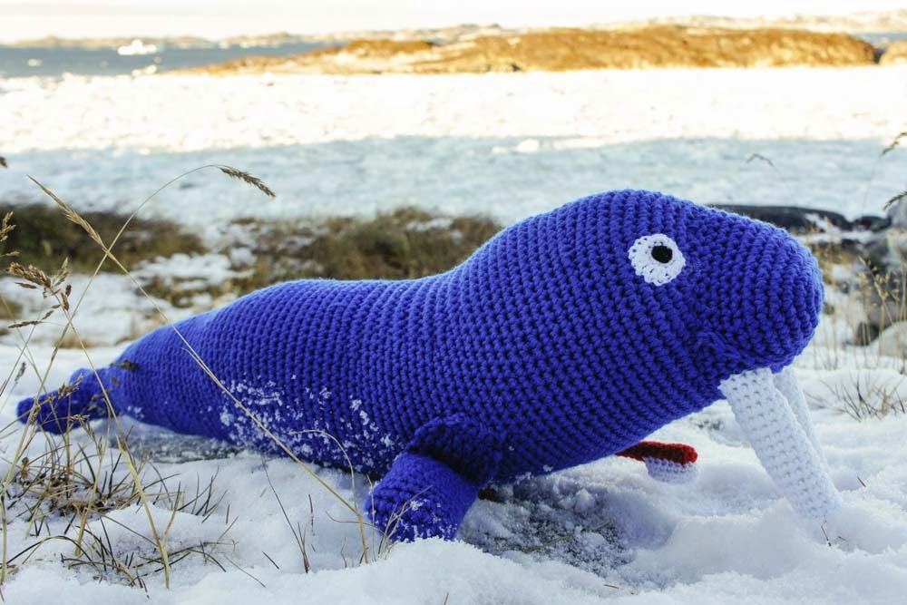 Hvalrossen er lavet i dobbelt bomuldsgarn uden opskrift og er 40-50 cm lang.